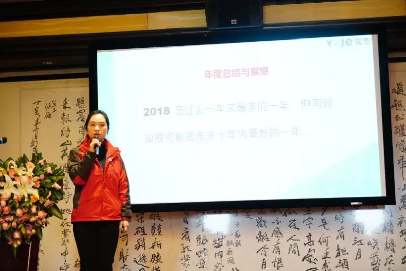 接下来,重庆友杰的销售总监杨洁女士做了年度报告和新年展望,她指出2018是最差的一年,同时也是最好的一年。大家要做好面对更加多变复杂市场环境的准备,同时更要提升自己,坚定信心,在竞争激烈的红海里面开拓出属于自己的蓝海。