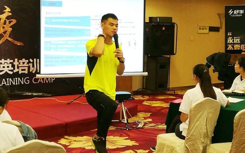 老师在为学员们讲解运动能力测试,运动能力测试是一种较全面的身体素质测试,可以测试人的平衡性、柔韧性、协调性以及核心力量等。通过这些测试能让顾客更好的了解自身的身体状况和能力,从而更有针对的进行训练和器材采购。这也是我们舒华对客户服务的一种延伸。